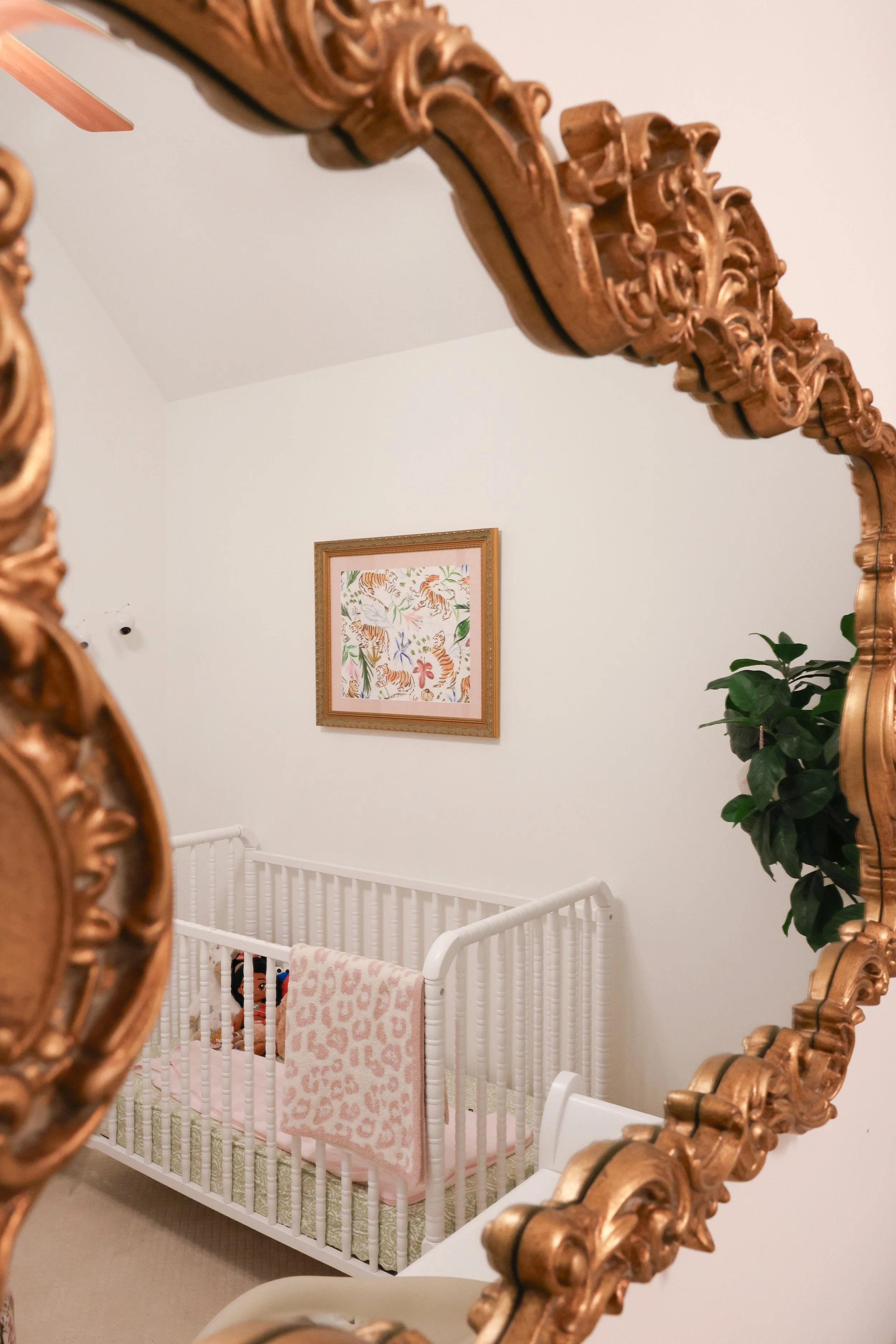 The chunky gold-framed mirror from Wayfair adds the perfect touch of elegance above the dresser. It ties the room together and makes the space feel brighter and bigger.